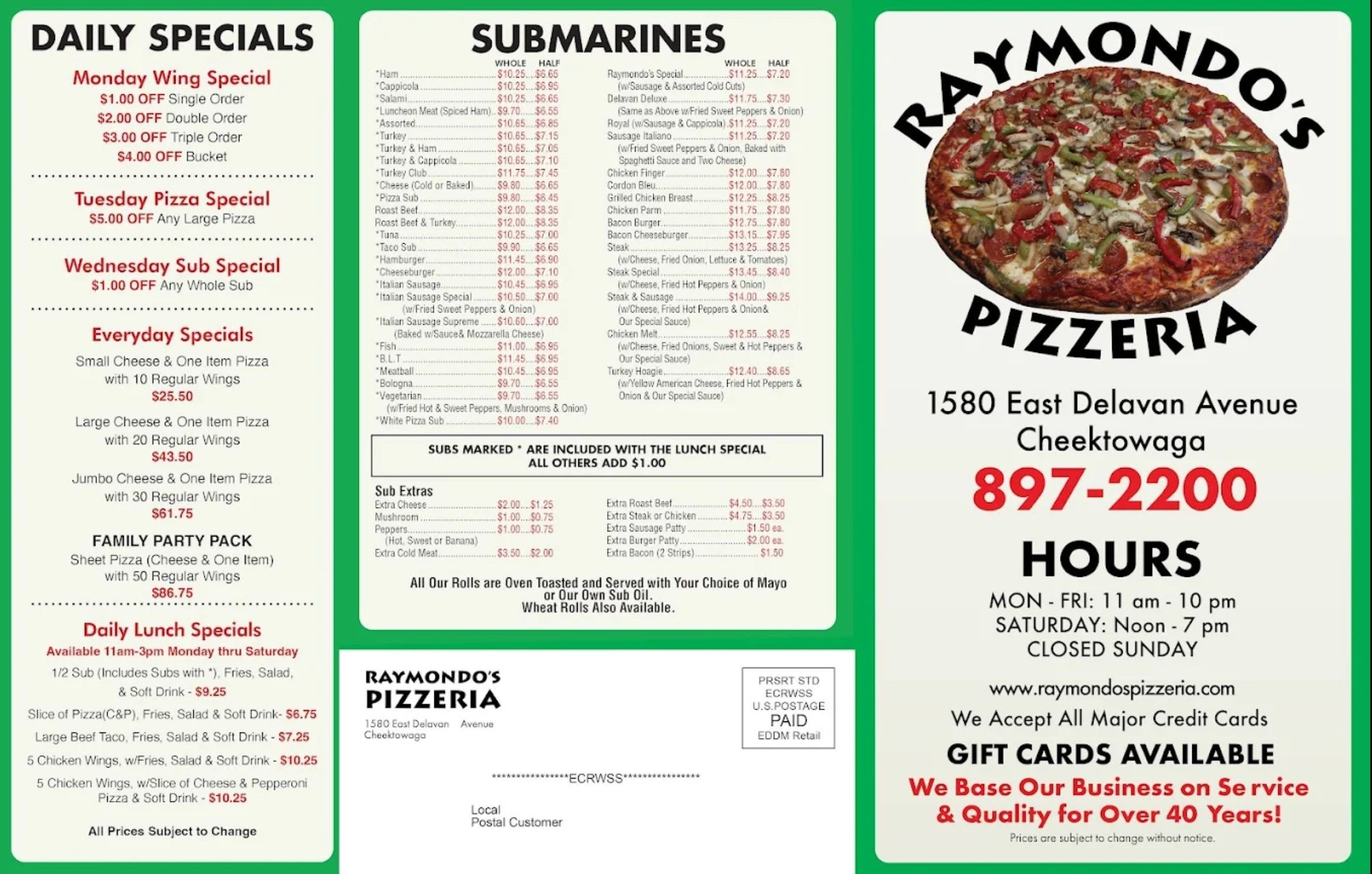 Raymondo's Pizzeria has been a cornerstone of the Cheektowaga community for over three decades, serving authentic Buffalo-style pizza that keeps generations coming back. What began in the late 1980s has evolved into a beloved local institution, now under the ownership of Jen, who brings both passion and a personal connection to every slice served. The pizzeria has built its reputation on consistently exceptional food. Their massive slices have become legendary throughout Western New York, with specialty pizzas that stand out even in Buffalo's competitive pizza landscape. The chicken pizza, in particular, has earned devoted fans who consider it the finest in the region. Traditionalists rave about the perfectly cupped pepperoni—a nostalgic nod to classic Buffalo pizza craftsmanship that transports longtime residents back to earlier decades. But Raymondo's isn't just about pizza. Their taco salad has maintained a loyal following for seventeen years, while their pit-cooked chicken wings deliver the authentic Buffalo flavor locals demand. The subs, made with Costanzo's rolls, have transportation workers and vegetarians alike singing their praises. Options range from hearty steak pizzas topped with banana peppers to fully customizable vegetarian subs featuring fresh vegetables and multiple cheese varieties.